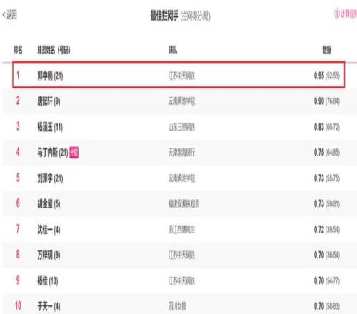 郭中楠局均攔網(wǎng)0.95次排名聯(lián)賽第一,女排聯(lián)賽B組云南隊(duì)的唐懿軒0.90次排名第二,楊涵玉0.83次排名第三,天津女排外援馬丁內(nèi)斯0.75次排名第四。