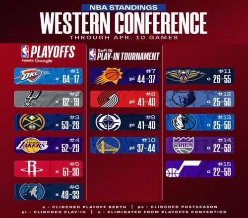 因此前10一共僅有4種情況,取決于掘金與湖人誰能拿下第三,以及開拓者與快船最終誰能鎖定第八位置。