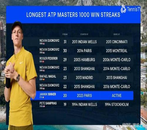 在2-0淘汰阿利亞西姆、取得對(duì)陣對(duì)手的五連勝之后,辛納成為了歷史上第四位能夠取得ATP大師賽20連勝的男子單打選手,在他前面都有哪些人?他有望打破紀(jì)錄嗎?