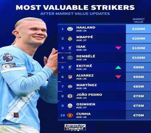 德轉(zhuǎn)前鋒身價(jià)前10:哈蘭德、姆巴佩2億歐領(lǐng)銜,伊薩克1億第3