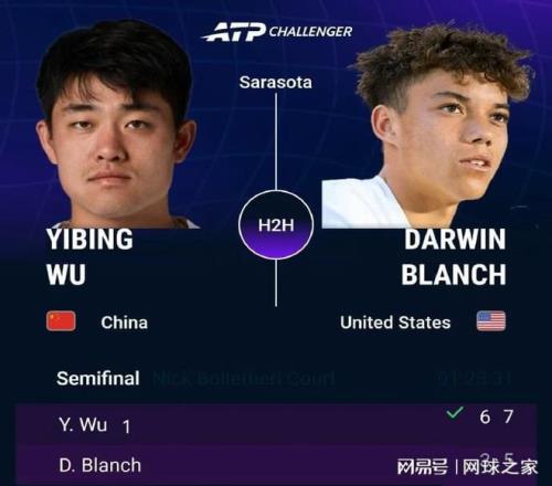 我們首先來關(guān)注中國一哥吳易昺。在北京時間昨晚進行的ATP挑戰(zhàn)賽薩拉索塔站半決賽中,吳易昺發(fā)揮穩(wěn)定,以6-3 7-5擊敗18歲的美國小將布蘭奇,順利晉級決賽。