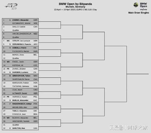 ATP500慕尼黑站:小茲維列夫、謝爾頓、布勃里克、科博利作為前四號種子領(lǐng)銜。中國球員張之臻出戰(zhàn),首輪對陣6號種子達爾德里。