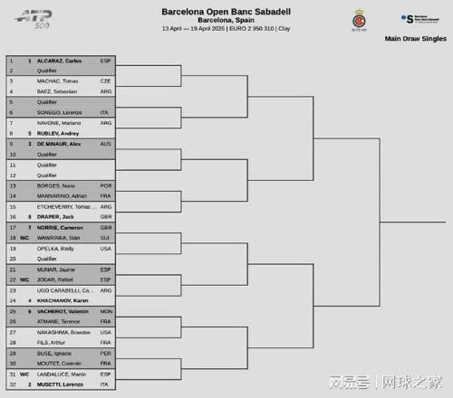 我們再來關(guān)注下周賽事。北京時間昨晚,下周的四站巡回賽相繼公布了正賽簽表。ATP500巴塞羅那站:阿爾卡拉斯、穆塞蒂、德米納爾、卡恰諾夫作為前四號種子出戰(zhàn)。前八大種子對位:阿爾卡拉斯--盧布列夫、德米納爾--德雷珀、諾里--卡恰諾夫、瓦舍羅--穆塞蒂。