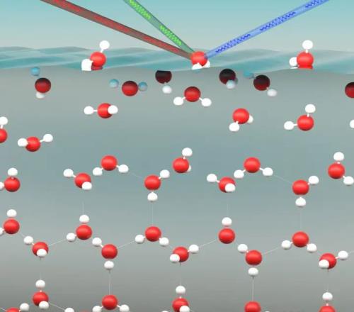 兩束激光(紅色與綠色)在表面匯聚后形成新的光束(藍(lán)色),包含了有關(guān)冰表面水分子排列的信息。