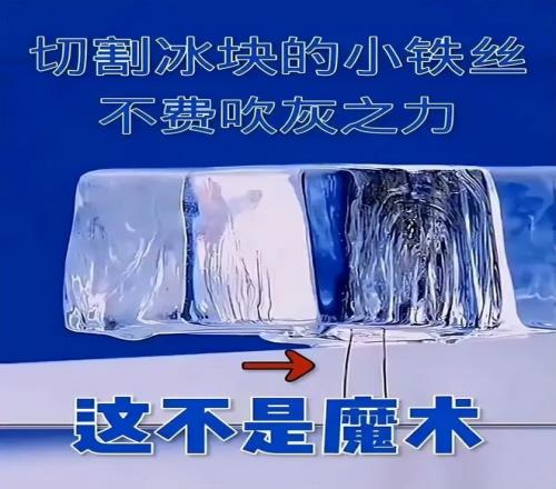 這個(gè)實(shí)驗(yàn)的原理的是,細(xì)鐵絲與冰塊的接觸面積極小,重物帶來的壓力會(huì)使接觸點(diǎn)的冰熔點(diǎn)降低,冰融化成水,鐵絲在重力作用下向下移動(dòng),而鐵絲上方融化的水脫離高壓環(huán)境后,又會(huì)重新凝結(jié)成冰,最終形成“鐵絲穿冰,冰塊完好”的神奇現(xiàn)象,很多讀者在家也能輕松完成這個(gè)實(shí)驗(yàn),直觀感受壓力對冰熔點(diǎn)的影響。