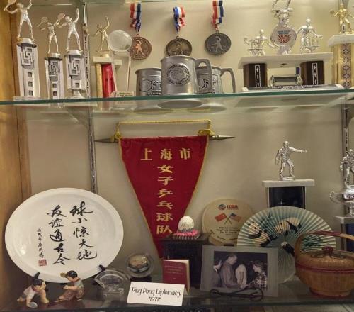 前美國(guó)女子乒乓球隊(duì)隊(duì)員康妮?史維利斯家中的中美“乒乓外交”陳列柜(康妮?史維利斯供圖)
