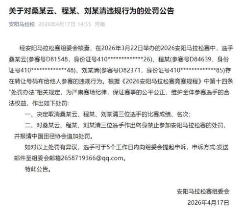 新京報(bào)訊 4月17日,河南安陽(yáng)馬拉松賽組委會(huì)發(fā)布處罰公告:經(jīng)安陽(yáng)馬拉松賽組委會(huì)核查,在2026年3月22日舉辦的2026安陽(yáng)馬拉松賽中,選手桑某云(參賽號(hào)D81548,身份證號(hào)410*************26)、程某(參賽號(hào)D84639,身份證號(hào)410*************48)、劉某清(參賽號(hào)D82371,身份證號(hào)410*************85)存在轉(zhuǎn)讓號(hào)碼布給他人參賽的違規(guī)行為。根據(jù)《2026安陽(yáng)馬拉松賽競(jìng)賽規(guī)程》中第十四條“處罰辦法”相關(guān)規(guī)定,為嚴(yán)肅賽場(chǎng)紀(jì)律,保證賽事的公平公正,維護(hù)全體參賽選手的合法權(quán)益,作出如下處罰: