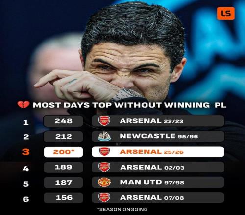 隨著今天凌晨客場戰(zhàn)勝伯恩利,曼城憑借進球數(shù)的優(yōu)勢反超阿森納來到了英超積分榜第一的位置。本賽季阿森納占據(jù)積分榜榜首長達 200 天,倘若槍手最終無緣英超桂冠,那么這將成為英超歷史上單賽季領(lǐng)跑天數(shù)最多卻無緣冠軍的第三高紀錄。同時,阿森納也是此榜單中出現(xiàn)次數(shù)最多的球隊。