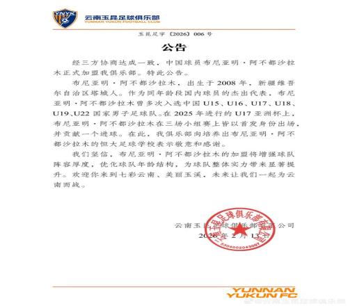 經(jīng)三方協(xié)商達成一致,中國球員布尼亞明-阿不都沙拉木正式加盟我俱樂部。特此公告。