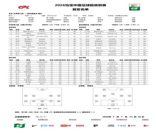 3月7日15點30分,2026賽季中超聯(lián)賽首輪,天津津門虎對陣升班馬重慶銅梁龍的比賽在天津泰達足球場進行,目前本場比賽的首發(fā)替補名單已經(jīng)正式出爐!
