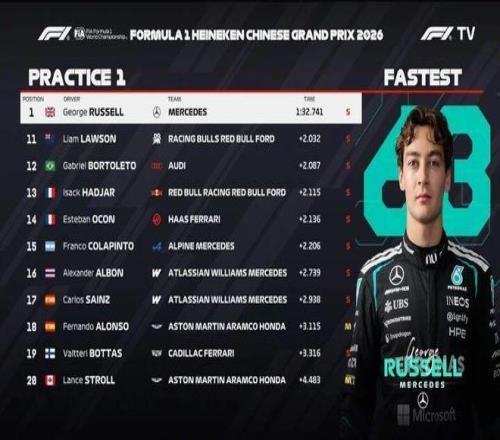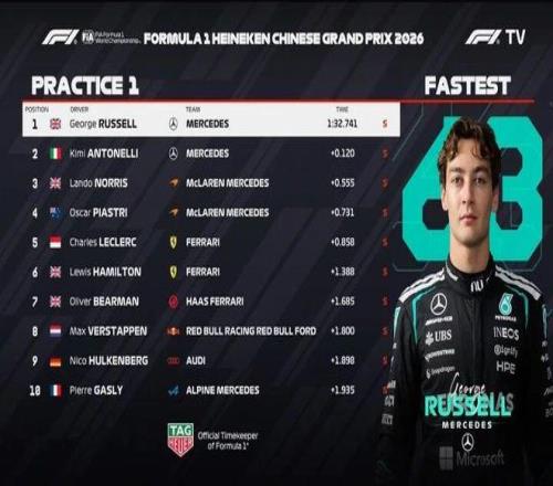 2026F1中國站今天中午結(jié)束了第一次練習(xí)賽,在澳大利亞站表現(xiàn)驚艷的梅奔雙雄延續(xù)強(qiáng)勢表現(xiàn),拉塞爾以1分32秒741輕松跑出全場最快,隊(duì)友安東內(nèi)利以0.120秒的差距緊隨其后,諾里斯排名第三。第四到第十依次是皮亞斯特里、勒克萊爾、漢密爾頓、比爾曼、維斯塔潘、霍肯博格以及加斯利。