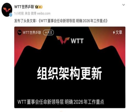 文章寫道,2026年首屆WTT世界乒聯(lián)董事會會議于3月1日召開。根據(jù)國際乒聯(lián)執(zhí)行委員會新的職責(zé)劃分,國際乒聯(lián)主席佩特拉·索林和執(zhí)行副主席瓦希德·奧肖迪代表國際乒聯(lián)出任WTT世界乒聯(lián)董事會成員。隨后在WTT董事會會議上,佩特拉·索林被任命為WTT董事會主席。兩人分別接替劉國梁與卡里爾·阿爾·默罕納迪此前擔(dān)任的相關(guān)職務(wù)。