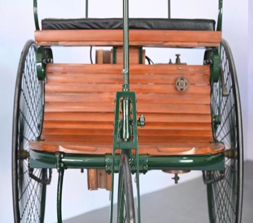 Benz Patent,1886。1886年,卡爾·本茨試制了一臺單缸四沖程汽油機(jī),并安裝在由鋼管和木板構(gòu)成的三輪車架上。該車采用了鋼條幅輪圈和實(shí)心橡膠輪胎,通過轉(zhuǎn)動(dòng)手柄帶動(dòng)齒輪來完成轉(zhuǎn)向,發(fā)動(dòng)機(jī)經(jīng)過傳動(dòng)帶機(jī)構(gòu)和鏈條驅(qū)動(dòng)后輪,速度可達(dá)到15公里/小時(shí)。