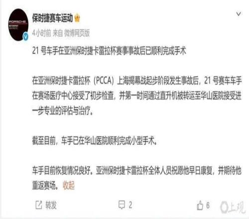 3月15日,亞洲保時(shí)捷卡雷拉杯房車(chē)賽組委會(huì)發(fā)布 “報(bào)平安” 信息:在14日上海揭幕戰(zhàn)發(fā)車(chē)階段遭遇事故后,保時(shí)捷卡雷拉杯亞洲組21號(hào)車(chē)手已在華山醫(yī)院接受小型手術(shù),目前車(chē)手恢復(fù)情況良好。