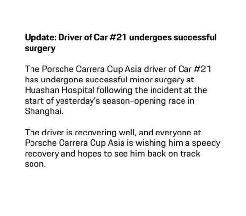 據(jù)中國(guó)首位F1賽季全勤報(bào)道者錢(qián)俊透露:3月15日,亞洲保時(shí)捷卡雷拉杯房車(chē)賽組委會(huì)發(fā)布通告,標(biāo)題為 “最新消息:21號(hào)車(chē)車(chē)手手術(shù)成功”。通告表示,“在昨日上海揭幕戰(zhàn)發(fā)車(chē)階段發(fā)生事故后,保時(shí)捷卡雷拉杯亞洲組21號(hào)車(chē)車(chē)手已在華山醫(yī)院成功接受小型手術(shù)。目前車(chē)手恢復(fù)情況良好,保時(shí)捷卡雷拉杯亞洲組全體人員祝愿他早日康復(fù),期待他重返賽場(chǎng)?!?/p>