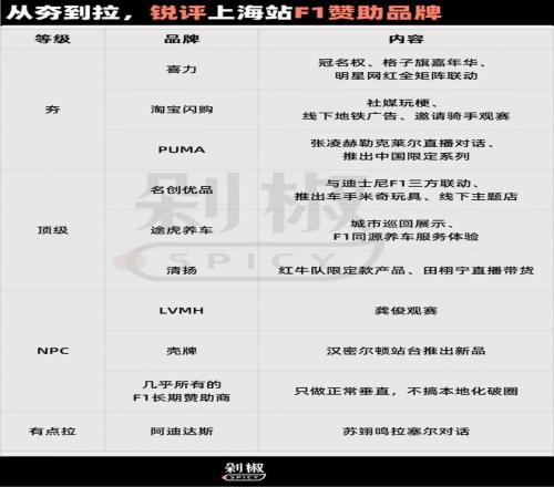 據(jù)此,剁椒Spicy在F1上海站尾聲觀察,推出一份純主觀的從夯到拉銳評F1中國區(qū)品牌合作贊助效果列表。評價標(biāo)準(zhǔn)分別是:話題出圈度,品牌形象塑造和本地化策略高明度。
