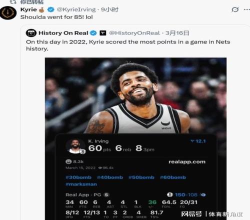 還有一則新聞,乍一看簡(jiǎn)直像AI杜撰出來(lái)的。就在今早,歐文突然在自己的社交媒體上轉(zhuǎn)發(fā)了一條四年前自己砍下60+得分的比賽視頻。那是在2022年3月16日,當(dāng)時(shí)歐文還是籃網(wǎng)隊(duì)的一員,在面對(duì)魔術(shù)隊(duì)的比賽中,他狂砍60分,還投進(jìn)8個(gè)三分球,摘下6個(gè)籃板,這一得分也創(chuàng)下了他個(gè)人單場(chǎng)得分的新高。
