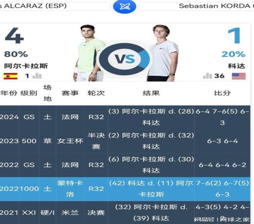 職業(yè)生涯至今,小科達(dá)與阿爾卡拉斯交鋒五次,一勝四負(fù),而且處于一波三連敗之中。唯一的勝利是2022年蒙特卡洛大師賽第二輪,剛剛奪取邁阿密大師賽冠軍的阿爾卡拉斯,竟然就在轉(zhuǎn)戰(zhàn)紅土賽季的第一站比賽中,被小科達(dá)拉下馬來(lái)。2024年法網(wǎng)三連敗于阿爾卡拉斯之后,小科達(dá)再無(wú)機(jī)會(huì)對(duì)陣阿爾卡拉斯,挑戰(zhàn)如日中天的世界第一。