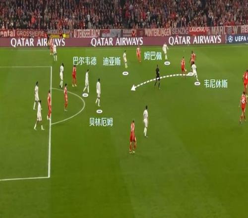 拜仁的第二個(gè)進(jìn)球,問題就是出在姆巴佩、韋尼休斯和迪亞斯的第一道防線站位有很大缺陷,導(dǎo)致被于帕梅卡諾自己帶球以點(diǎn)破面。