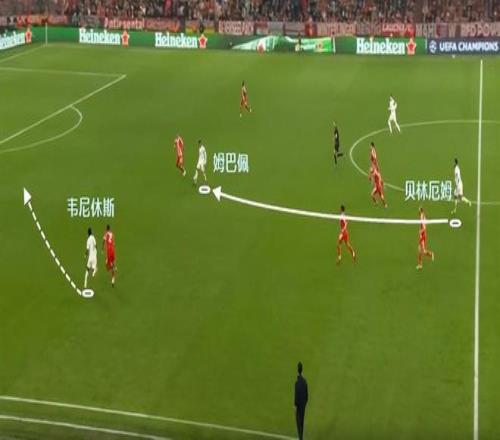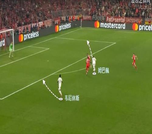 拜仁整體隊(duì)形太高,縱深空間留的很大。姆巴佩突然轉(zhuǎn)型獵豹,利用自己的沖刺,接應(yīng)到了韋尼休斯的妙傳,讓皇馬取得半場3比2的領(lǐng)先,追平了兩回合總比分。