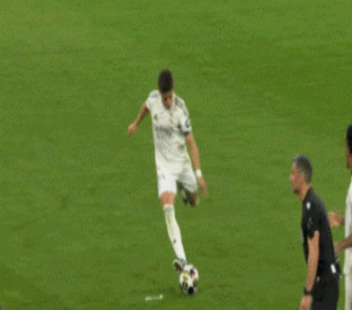 進(jìn)攻的發(fā)起,依舊來自于貝林厄姆,他分球后前插,接應(yīng)門將的長傳,漂亮停球后轉(zhuǎn)身擺脫送直塞??上钒团宓耐G蛸|(zhì)量跟貝林厄姆差距有點(diǎn)大,隨后他又無視了韋尼休斯的前插。