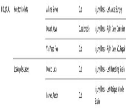 北京時間4月18日,NBA官方公布了火箭vs湖人首戰(zhàn)的傷情報告,火箭一方,范弗利特(右膝前交叉韌帶手術(shù)康復)、亞當斯(左腳踝手術(shù)康復)缺陣,杜蘭特(右膝挫傷)被列為出戰(zhàn)成疑。湖人一方,東契奇(左腿筋拉傷)、里夫斯(左側(cè)腹斜肌拉傷)缺陣。雙方的首場比賽,將在4月19日上午8點30分進行。