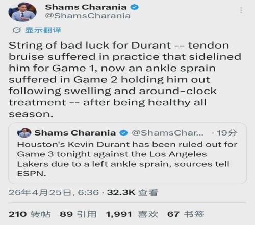 北京時間4月25日上午6點半,據(jù)NBA名記Shams報道,火箭球星杜蘭特因左腳踝扭傷,缺席今天和湖人G3。這是杜蘭特本輪系列賽第二次缺席,G1他因為右膝挫傷而缺陣。G2杜蘭特復出鏖戰(zhàn)41分鐘,第四節(jié)還剩7分多鐘時扭傷腳踝。