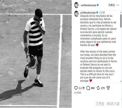 在今年的巴塞羅那公開賽,阿爾卡拉斯就已出現(xiàn)腕傷隱患,無奈退出后又缺席馬德里站。經(jīng)過全面評估,團隊最終做出放棄剩余紅土賽季的決定。這意味著,他不僅無緣衛(wèi)冕羅馬大師賽,更錯失了成為納達爾之后,又一位法網(wǎng)三連冠得主的歷史良機。