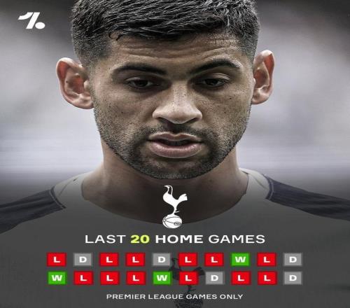 至此,熱刺最近20場(chǎng)英超主場(chǎng)比賽只取得3場(chǎng)勝利,其余場(chǎng)次戰(zhàn)績(jī)?yōu)?平12負(fù)。
