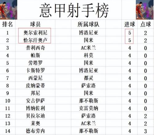 射手榜方面,意甲的射手們還是很低迷,奧爾索利尼和恰爾汗奧盧的5球都還是無(wú)人超過(guò),他們還是并列第1。德布勞內(nèi),萊奧,勞塔羅,邦尼等12人4球并列第3。