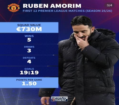 但去了曼聯(lián)之后,現(xiàn)實就明顯沒那么順利了:上任到現(xiàn)在54場只贏了21場,勝率不到40%,成績起伏大、杯賽表現(xiàn)也一般。折射到這份榜單上的數(shù)據(jù)——19進19失、5勝3平4負排第10——很像他在英超的真實處境:戰(zhàn)術理念不落后,強調前場壓迫與快速推進,但在陣容匹配、節(jié)奏控制和防線保護上始終找不到在葡超那種“攻守兩端都占優(yōu)”的感覺,只能算是勉強維持在中游偏上的水平。