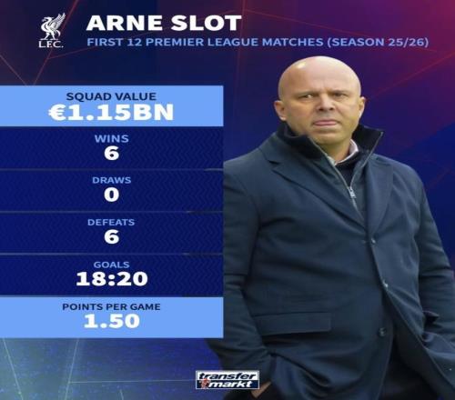 但放在這份榜單的語境下,這些理由很難完全說服人——利物浦是三隊里陣容最貴的,結果6勝6負排第12,18進20失、凈勝球為負,說明他在壓迫高度、陣型緊湊度和中后場保護之間的取舍一直沒理順,高位逼搶一旦被對手打穿,整條防線就暴露在大空間里。就本賽季目前的內容來說,弗蘭克算是穩(wěn),阿莫林算是一般,而身價最高卻踢成這個防守質量和排名的斯洛特,執(zhí)教表現(xiàn)確實是三人里最讓人失望的那個。