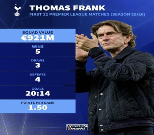 來到熱刺之后,這份榜單里的表現(xiàn)是20進14失、5勝3平4負排第9,本質上延續(xù)了他“先把防守和比賽強度立住,再慢慢加進攻配置”的思路:凈勝球為正、輸?shù)貌凰愣?,說明整體框架已經搭起來了,但進攻端還偏謹慎,更多靠戰(zhàn)術紀律和定位球吃飯,而不是強行打成真正的爭冠強度。