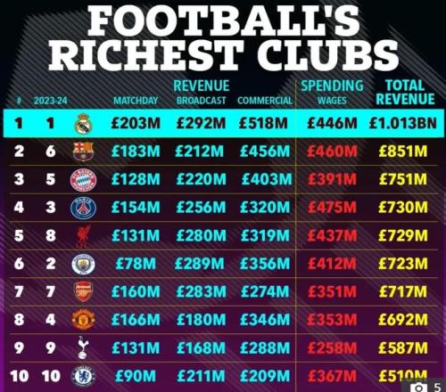 在德勤足球財(cái)富榜(Deloitte Money League)中,這家俱樂部跌至有史以來(lái)的最低排名,在全球最富有俱樂部的著名榜單中滑落至第八位。