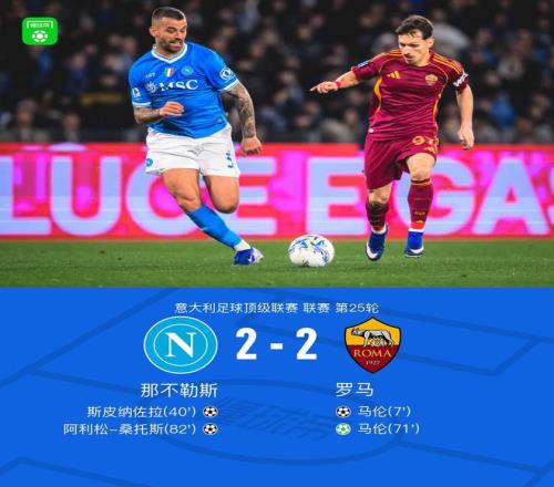 北京時間2月16日意大利足球甲級聯(lián)賽第25輪,那不勒斯主場對陣羅馬。上半場,薩拉戈薩助攻,馬倫破門。隨后,斯皮納佐拉遠射破舊主。下半場,韋斯利造點,馬倫主罰命中。焦瓦內(nèi)助攻,阿利松-桑托斯扳平比分。全場比賽結(jié)束,那不勒斯2-2羅馬。