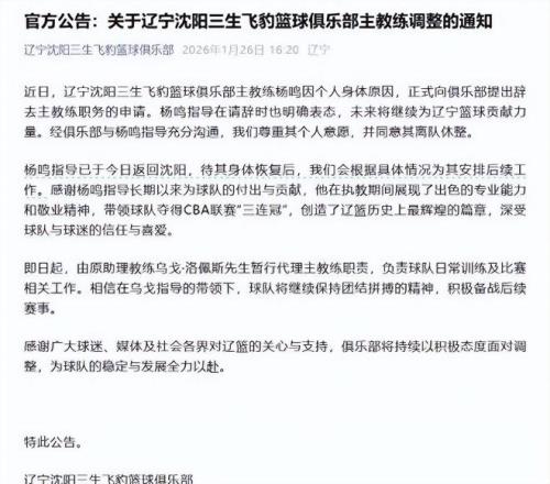 回溯至1月26日,遼寧沈陽三生飛豹籃球俱樂部發(fā)布一則官方通告,令無數(shù)鐵桿擁躉心頭一沉:經(jīng)研究決定,同意主教練楊鳴因健康原因提交的離職請求;助理教練烏戈·洛佩斯即日起代理主帥職責,全面接手球隊日常訓(xùn)練與臨場指揮工作。