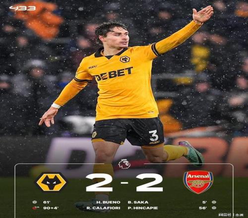 英超第31輪,阿森納客場2-2狼隊,先賽一場情況下5分優(yōu)勢領跑。薩卡破門打破15場進球荒,賴斯助攻,因卡皮耶打入個人處子球,圣地亞哥-布埃諾扳回一球,薩卡傷退,埃多齊補時絕平。