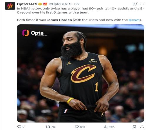 根據(jù)數(shù)據(jù)媒體的統(tǒng)計,一名球員換隊后的前五場比賽,能得到90分以上、助攻數(shù)超過40次以上且球隊?wèi)?zhàn)績5勝0負的球員只有詹姆斯-哈登,NBA歷史上出現(xiàn)了兩次都是哈登,上一次是出現(xiàn)在費城76人。