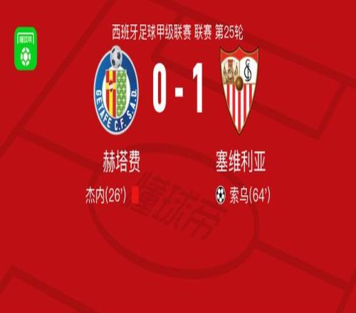 北京時(shí)間2月22日西班牙足球甲級聯(lián)賽 聯(lián)賽 第25輪,赫塔費(fèi)主場對陣塞維利亞。塞維利亞索烏破門。最終比分赫塔費(fèi) 0-1 塞維利亞。