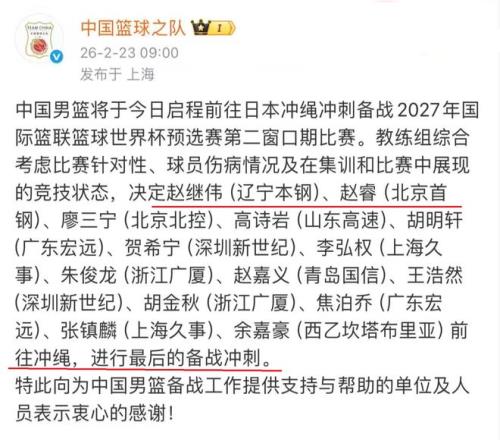 今天早上,中國男籃公布了一則重要消息,沒錯,那就是2027世界杯預選賽,第二窗口期的參賽球員,已經(jīng)是基本出爐,此番,郭士強一共帶了14名球員前往日本,準備2月26日與日本隊的比賽。郭士強之所以會帶14名球員前往,有一個重要因素,就是給球隊陣容,做更加充分地準備。