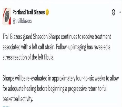 北京時間2月25日,開拓者官方更新傷病報告,后衛(wèi)謝登-夏普仍在接受左側小腿拉傷的相關治療。復查影像顯示,他出現(xiàn)了左側腓骨應力性反應。夏普將在約4–6周后接受重新評估,以確保傷勢充分愈合,之后再逐步恢復完整的籃球訓練與比賽。