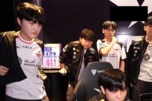 在對陣DK時的進場鏡頭中,Keria并未與隊友一起進場;而賽中的轉(zhuǎn)播鏡頭中,Keria在休息室里站著有一點吃力,需要用手撐著桌子。