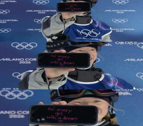 本屆冬奧自由式滑雪女子大跳臺預(yù)賽上發(fā)生了可愛一幕,德國選手Muriel Mohr完成第三跳后,在鏡頭前舉起手機(jī),上面是粉色的“for every girl with a dream”,盡管最終她未晉級決賽。