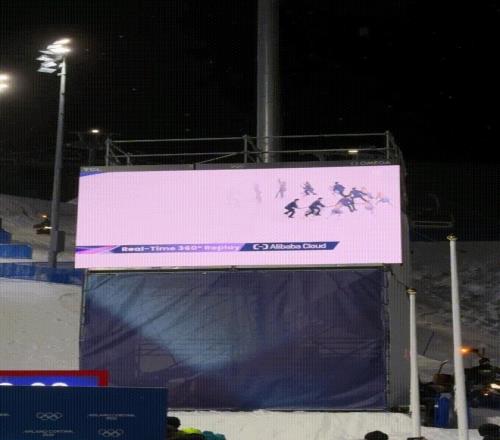 在米蘭-科爾蒂納冬奧會四大賽區(qū)之一的利維尼奧賽區(qū),當每一場比賽開始前,觀眾的目光往往會被場地中央那塊巨大的屏幕所吸引。