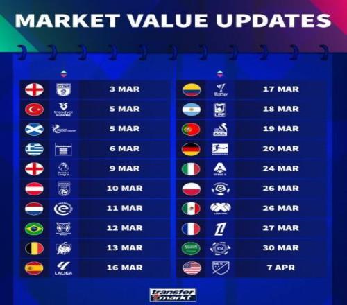 北京時間2月28日凌晨,德國轉(zhuǎn)會市場公布了各聯(lián)賽球員最新一期身價的更新時間,其中英超將在3月9日公布,西甲在3月16日公布,德甲在3月20日公布,意甲在3月24日公布,法甲在3月27日公布。