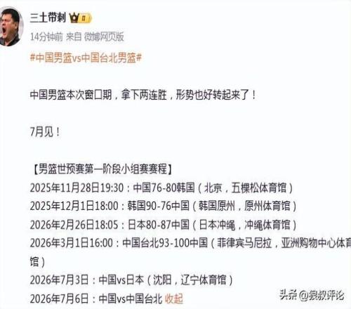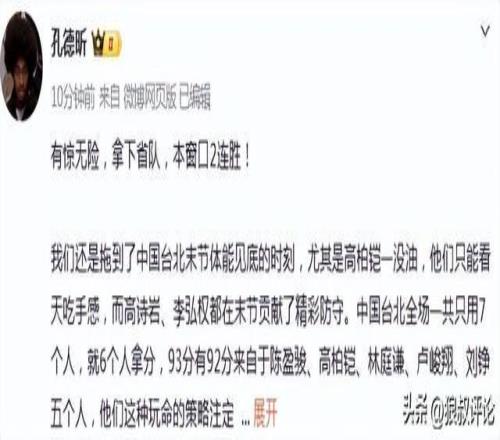 中國(guó)男籃逆轉(zhuǎn)中國(guó)臺(tái)北引熱議!媒體人盛贊李弘權(quán)逆轉(zhuǎn)英雄