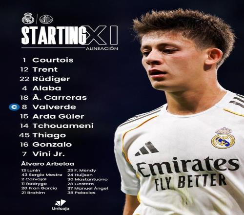 皇家馬德里首發(fā):1-庫爾圖瓦、12-阿諾德、22-呂迪格、4-阿拉巴、18-卡雷拉斯、8-巴爾韋德、15-居萊爾、14-楚阿梅尼、45-皮塔奇、16-貢薩洛、7-維尼修斯