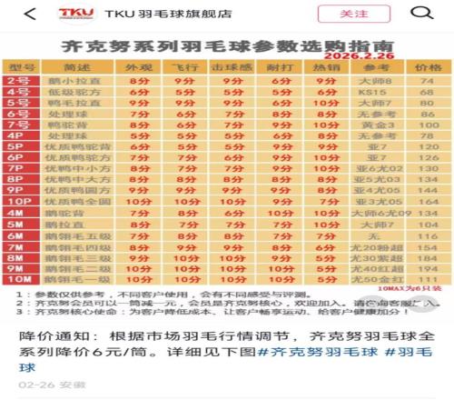 此外,2月24日,斯莊格運(yùn)動(dòng)互動(dòng)旗艦店公告稱決定對(duì)全系列羽毛球降價(jià)5元-10元/筒。2月26日,齊克努羽毛球旗艦店發(fā)布降價(jià)通知,齊克努羽毛球全系列降價(jià)6元/筒。