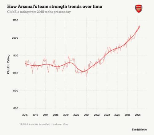 盡管并非完美無缺,但該系統(tǒng)目前將阿森納評(píng)為世界最佳球隊(duì)——鑒于他們本賽季在阿爾特塔執(zhí)教下國內(nèi)外賽場(chǎng)的表現(xiàn),這個(gè)地位很難反駁。下圖展示了自他執(zhí)教以來球隊(duì)的迅速崛起。