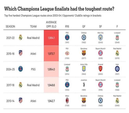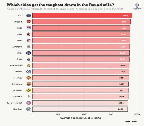 在所有參加過10次或以上16強(qiáng)比賽的球隊(duì)中,根據(jù)對(duì)手的ClubElo評(píng)分,只有巴黎圣日耳曼平均遭遇的對(duì)手比阿森納更強(qiáng)。